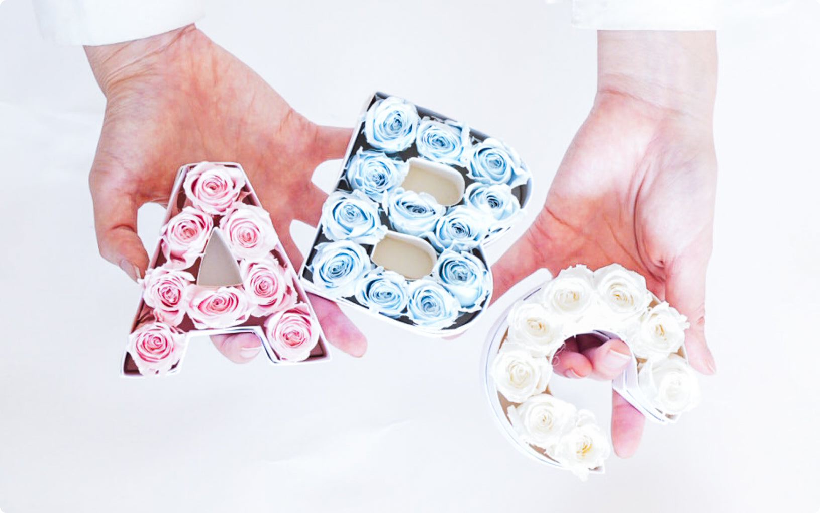 さまざまなライフイベントで愛され続けているバラをアルファベットの型いっぱいに敷き詰めました。誕生日や記念日、結婚式など特別な日の写真撮影や装飾にぴったりです。