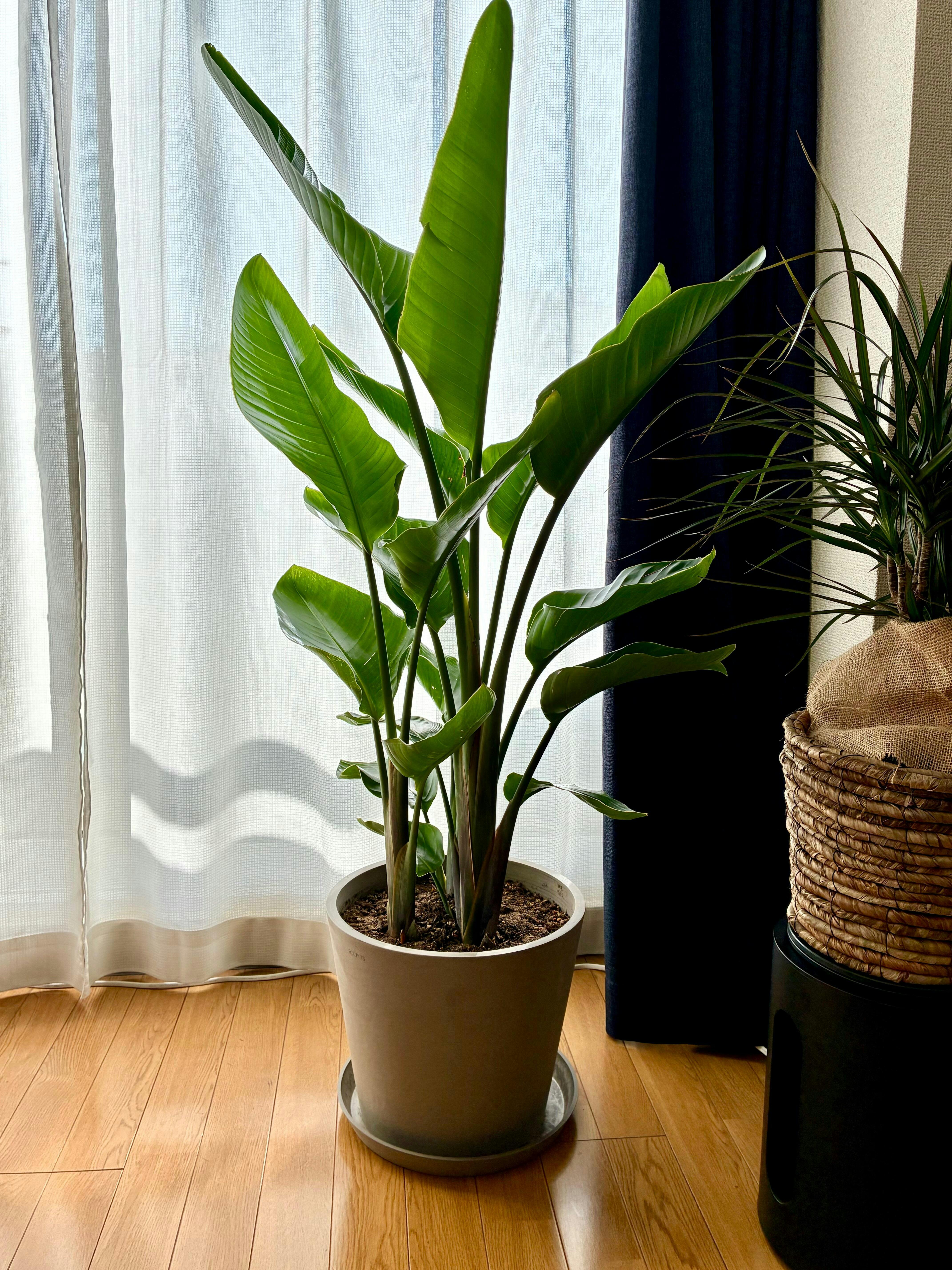 ストレリチア・オーガスタは、リゾート感のある観葉植物です。トロピカルな葉は存在感があり、おしゃれなインテリアとしてもおすすめです。一つで絵になるような植物を探しているならいかがでしょうか。