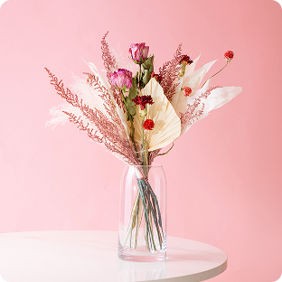 ドライフラワーのカーネーションやバラを用いてドライフラワーならではの上品で落ち着いた雰囲気に仕上げました。