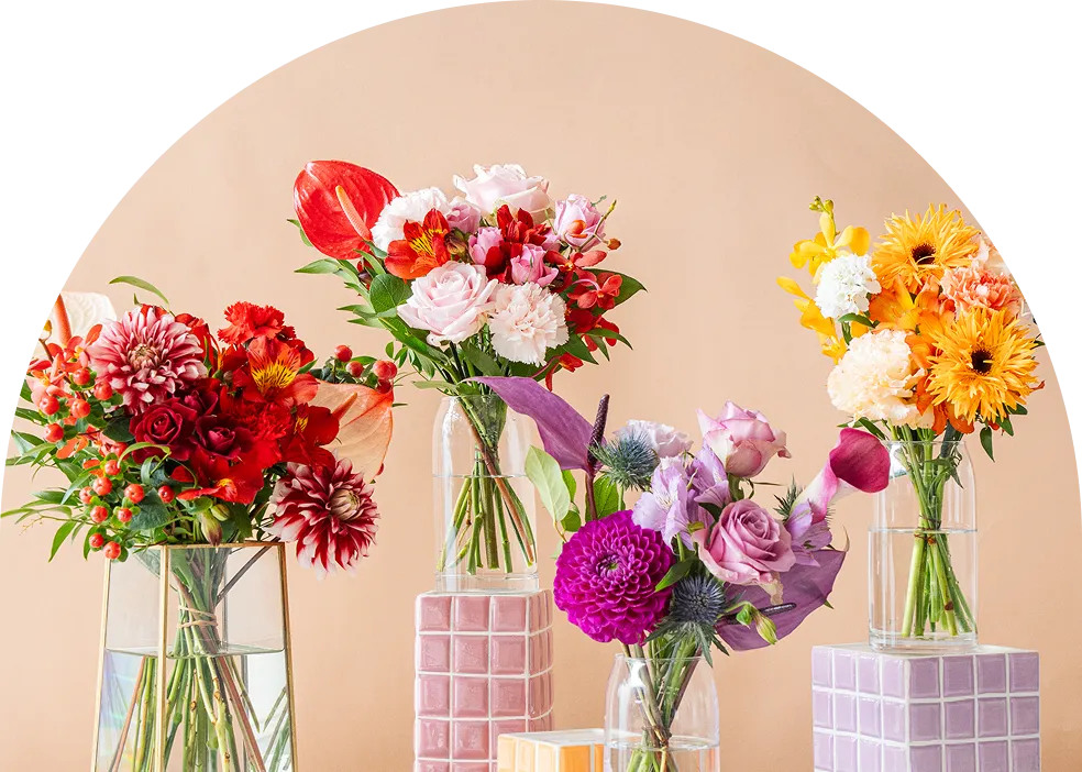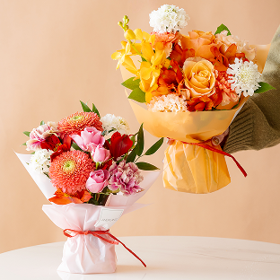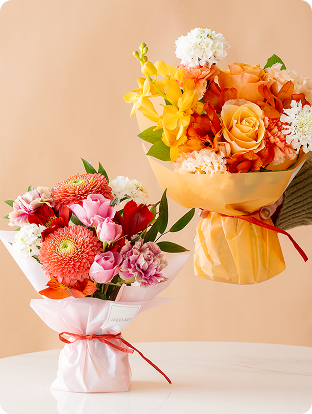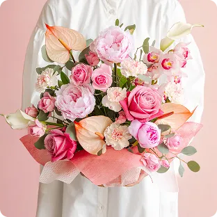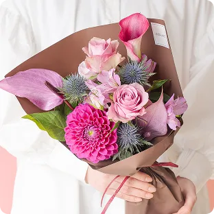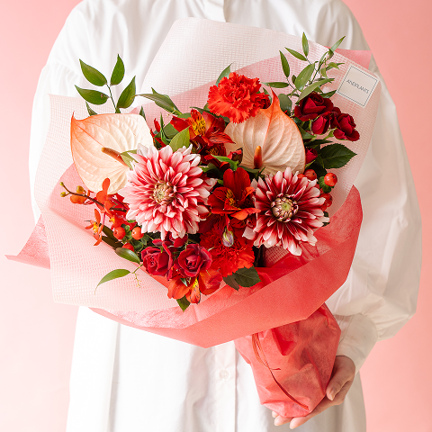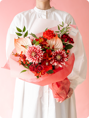 多彩な花材を贅沢に重ねた華やかな花束・アレンジメント。