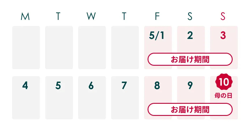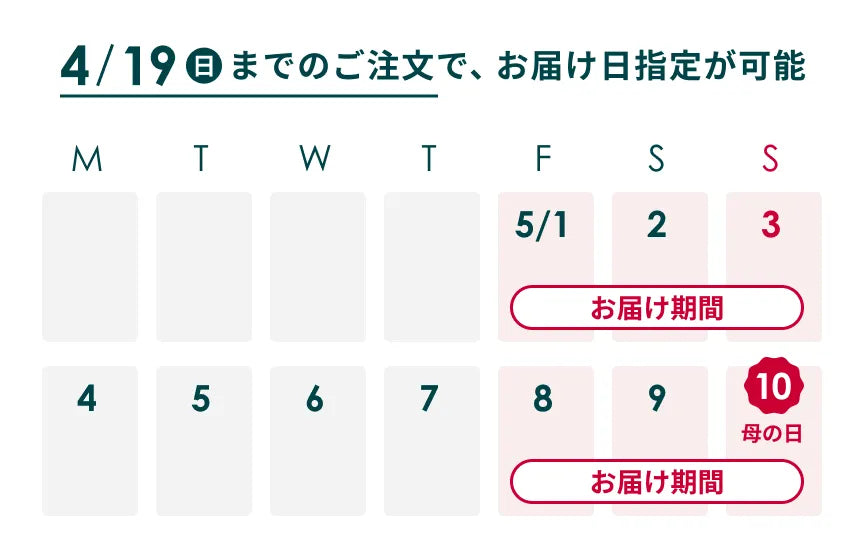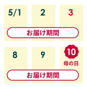 4/19(日)までにご注文いただくと、5/1(金) ~ 5/3日(日) ,または 5/8(金) ~ 5/10日(日)の中からお届け日を指定できます。母の日当日に確実にお届けしたい場合は、お早めにご注文ください。
