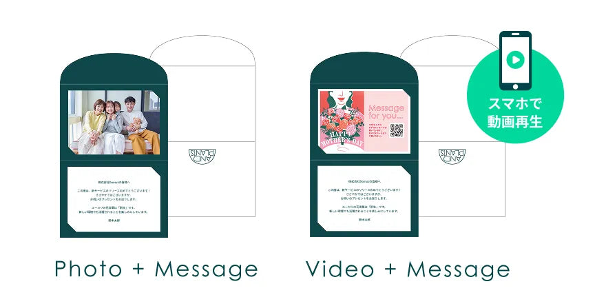 早期購入期間にお花をご注文いただいた方は、有料オプションとして写真付きのカードや動画を読み込むことができるQRコードを印字したカードをお届けすることができます。