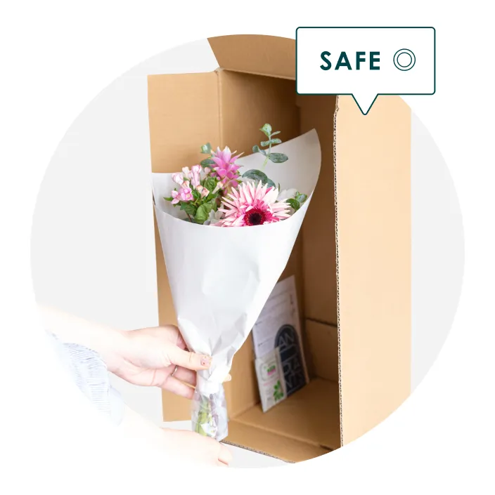 花束・アレンジメント・観葉植物などの過去3万回以上の配送実績から開発した、デリケートなブーケの輸送に特化した独自のボックスで丁寧にお届けいたします。