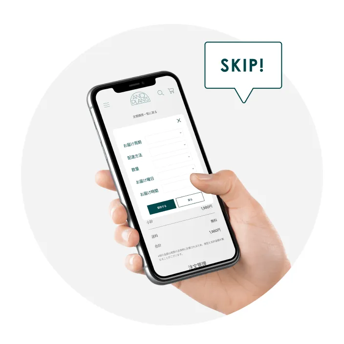 決済完了前の注文に限り、次回のお届けが不要となった場合はスキップができます。解約もいつでも可能です。