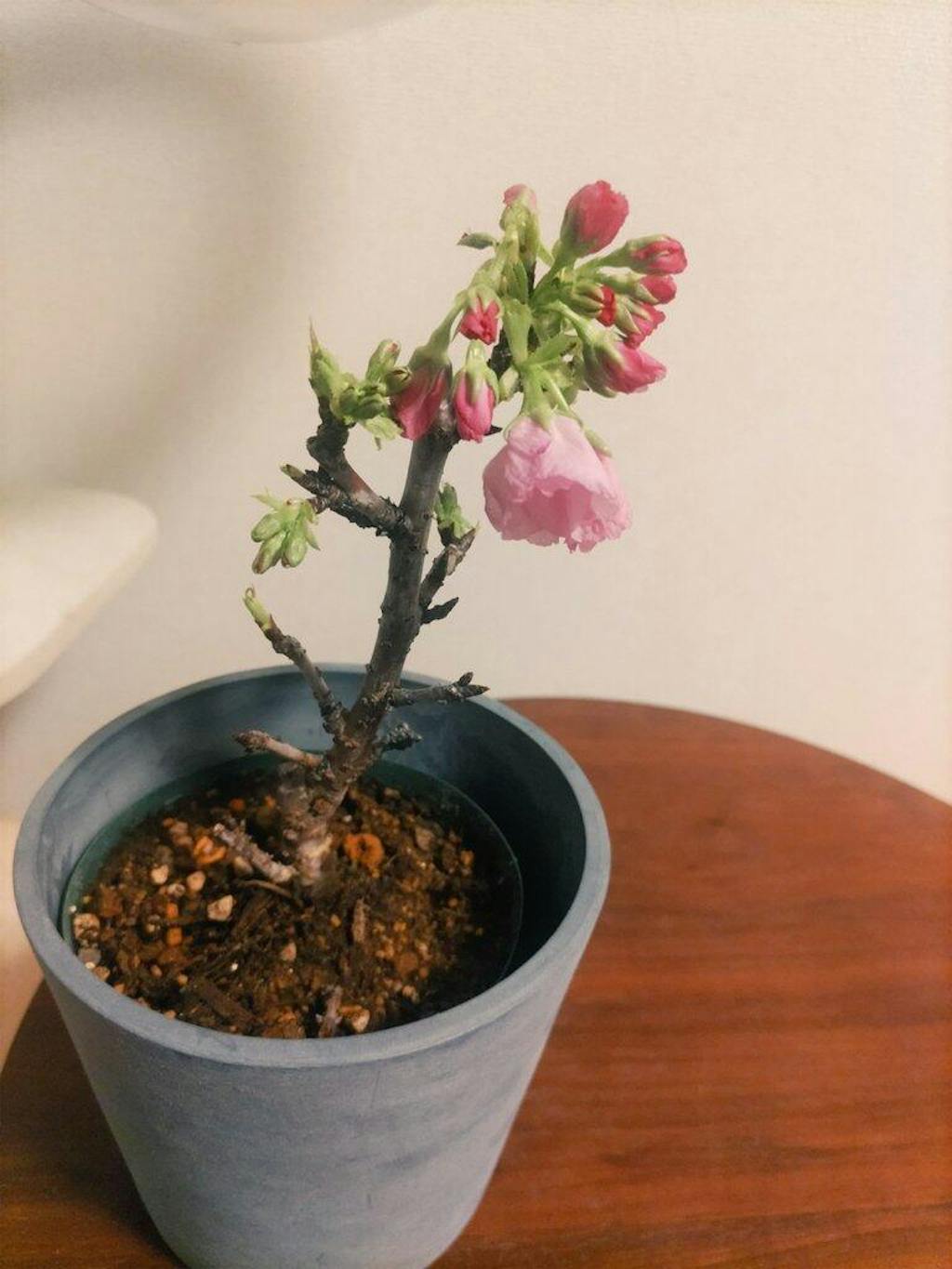 蕾から満開までの移ろいはもちろん、花後に広がる涼しげな葉桜、冬の静けさを湛えた枝姿まで、一年を通して季節の移ろいを感じられるのが魅力。スリット鉢で根の張りもよく、初心者の方でも安心して育てられます。