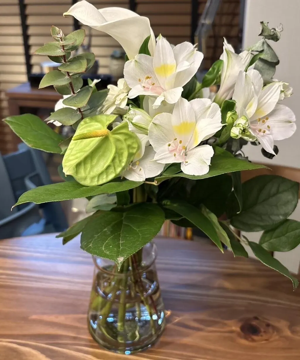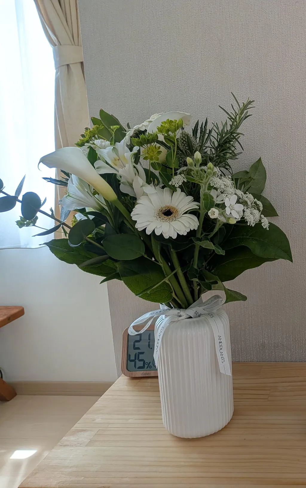 白と緑の花束は珍しかったらしく、驚き喜んでいました。花が好きな母が、活きのよいしっかりした花束だと言っていました。