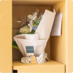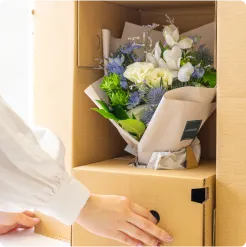 デリケートなお花の輸送に特化した独自のダンボールを開発。大切なブーケをしっかりと守り、丁寧にお届けします。