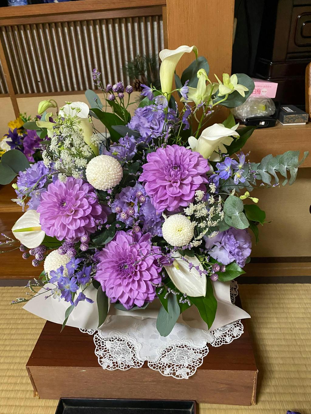 淡い色合いのイメージで注文しましたが、濃い紫の花材に代わっても高級感がありとても素敵なアレンジでした。お花好きだった祖母も喜んでいることと思います。