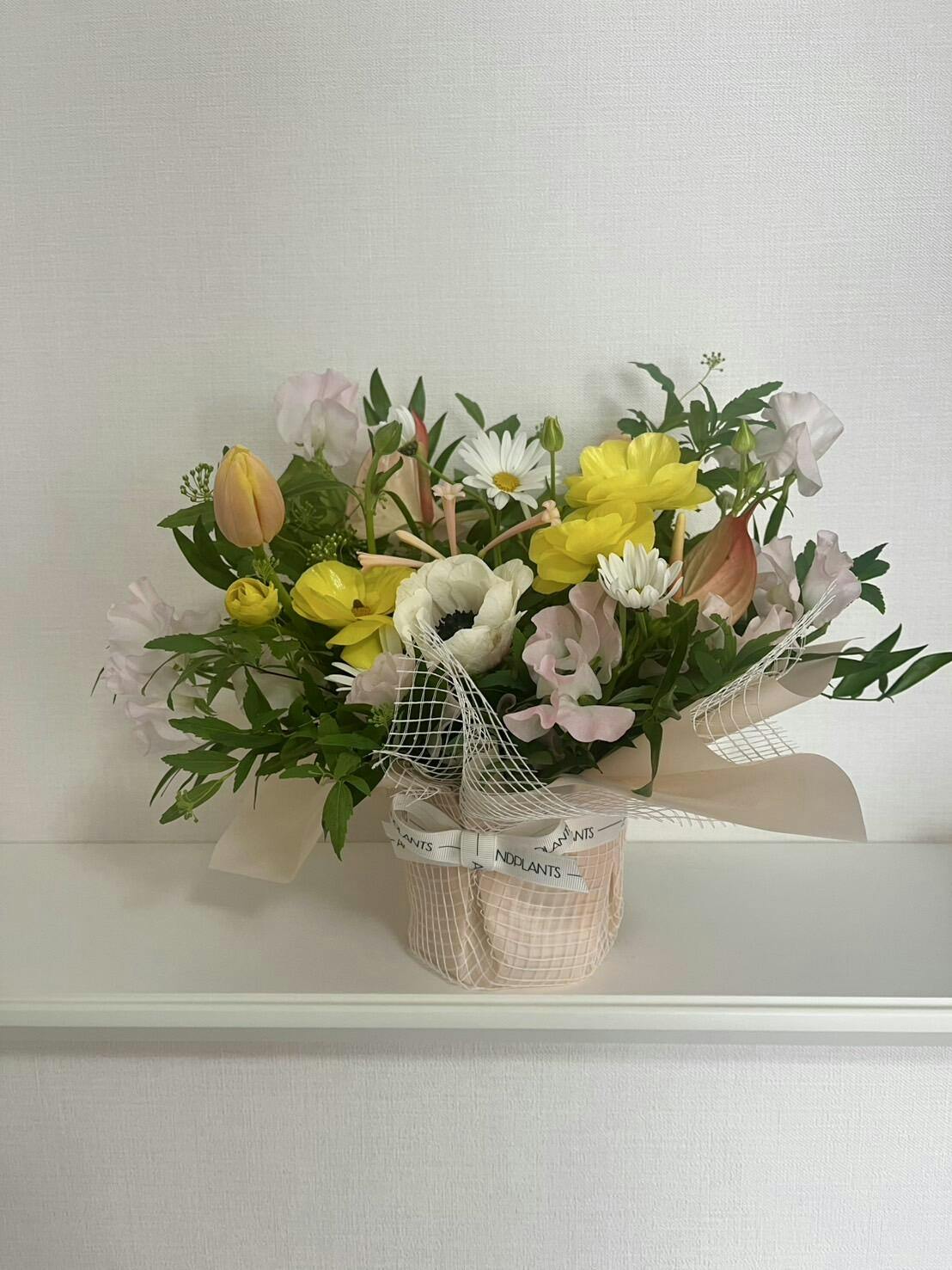 桜色のアネモネをメインに、桃色のチューリップや小花など、