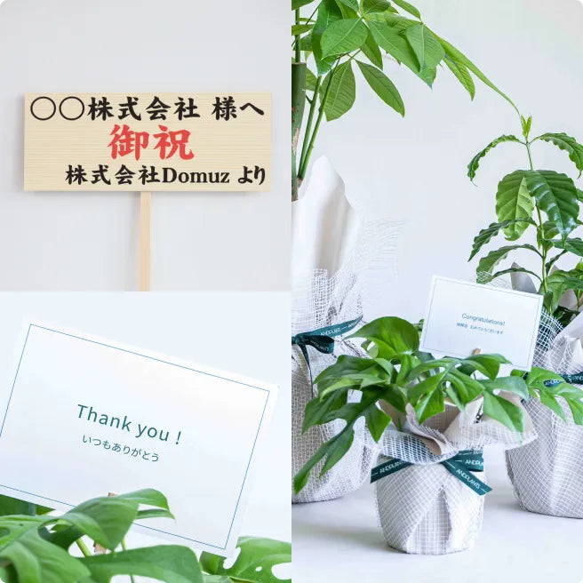 カート画面でメッセージの入力ができます。S,M,Lサイズには立て札も同梱できます。