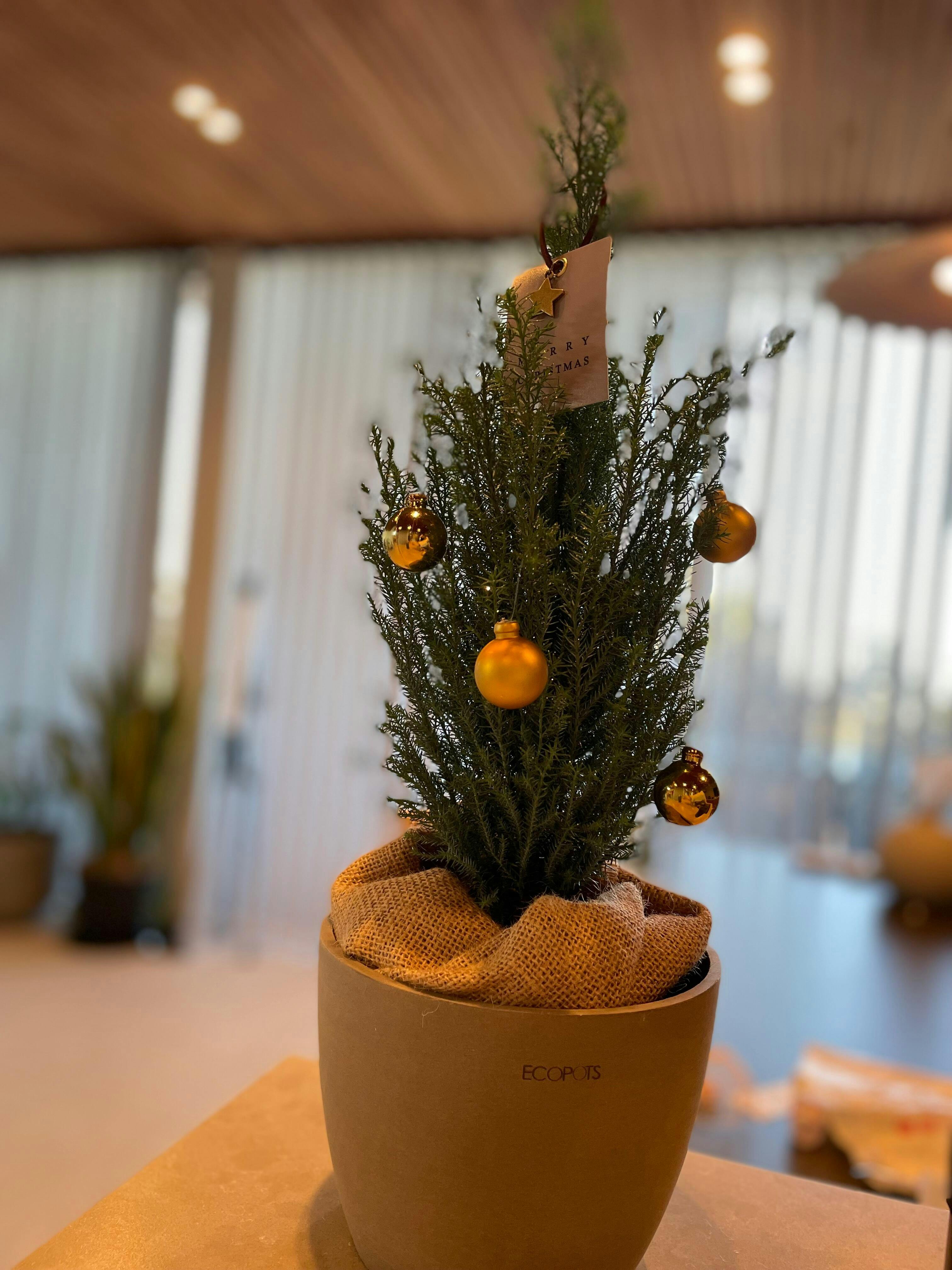 写真ではわかりにくいですが、ラメが付いていてキラキラしてとっても可愛いです。キッチンに置いて毎日愛でております。本物のツリーなので大切に育てていきたいと思います。